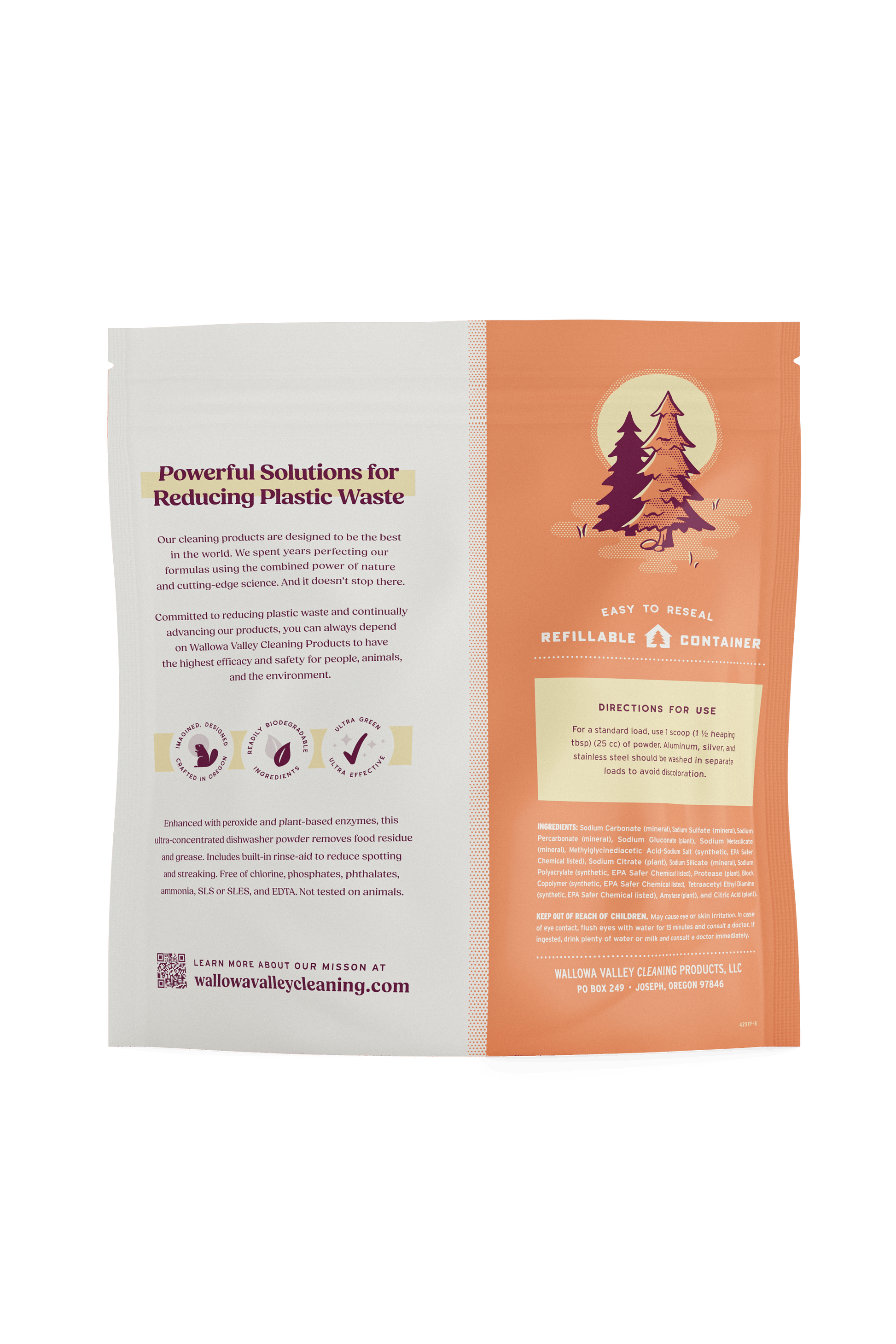 Enhanced with peroxide and plant-based enzymes, this ultra-concentrated dishwasher powder removes food residue and grease. Includes built-in rinse-aid to reduce spotting and streaking. Free of chlorine, phosphates, phthalates, ammonia, SLS or SLES, and EDTA. Not tested on animals.