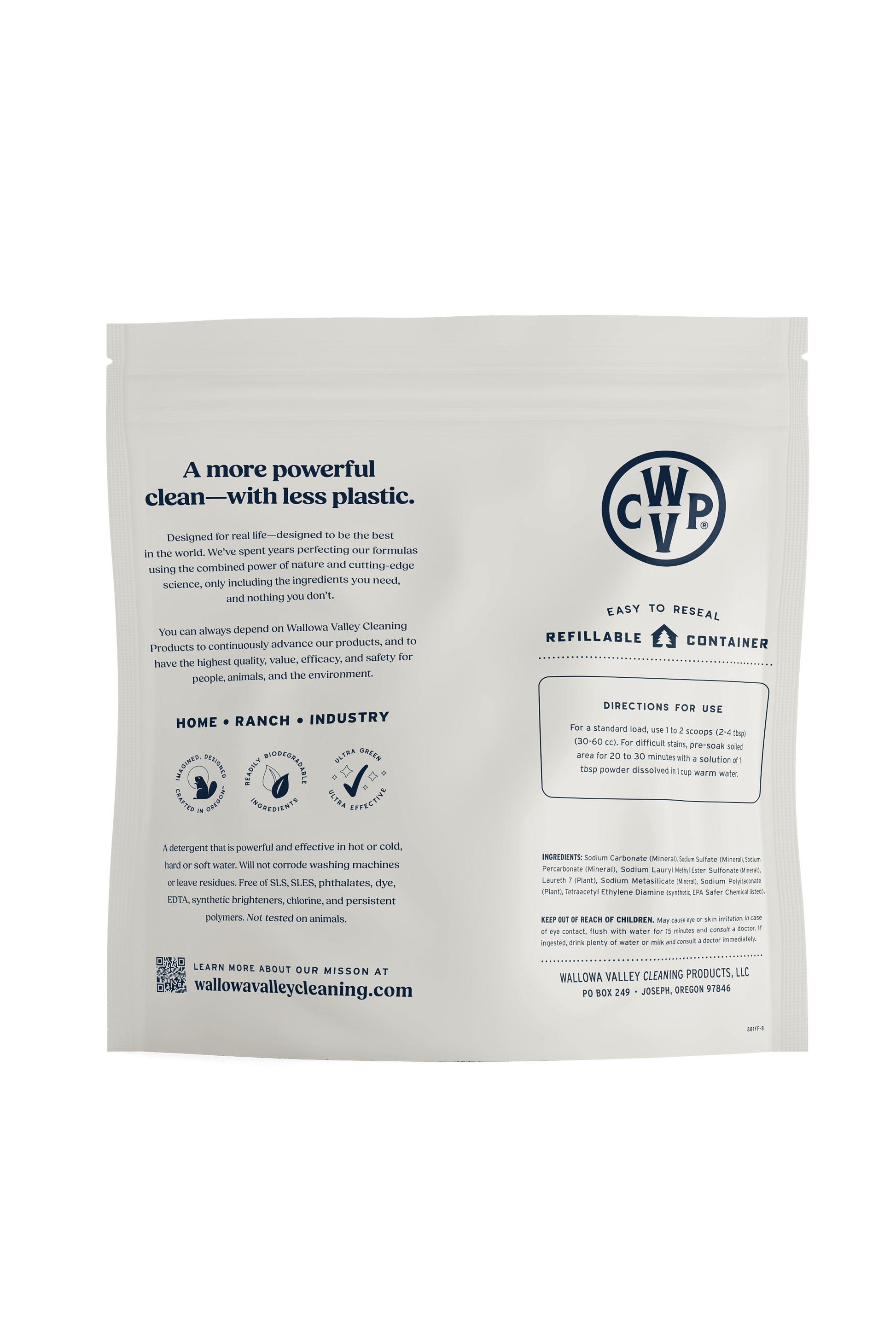 A detergent that is powerful and effective in hot or cold, hard or soft water. Will not corrode washing machines or leave residues. Free of SLS, SLES, phthalates, dye, EDTA, synthetic brighteners, chlorine, and persistent polymers. Not tested on animals.